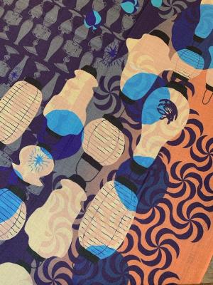 提灯、オイルランプ、と灯を連想するモチーフが温かく包んでくれるような柄いき。ドットにひっそりと潜んでるは鬼灯(ほおずき)も。
