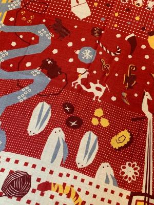 懐かしい賑やかなお正月を思い出す、あたたかでかわいい柄いき、鮮やかな赤色が新しい年の始まりを感じさせます。2025年の干支である大きなヘビは、早くも次の年を見つめ、すぐ隣では猪が走り去ろうとしている。羊の毛糸で遊ぶ虎や、楽器に隠れた動物など、ストールに潜むかわいい十二支たちをぜひ見つけてみて下さい。