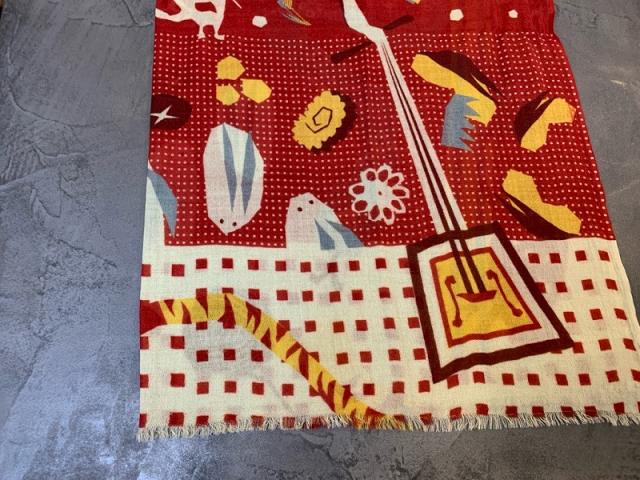 柔らかな風合いのウール素材。ひとつひとつのモチーフの新しい表現、その独自の世界観を物語にして一枚のストールに仕上げています。巻き方で見え方も変化する美しいグラフィックをお楽しみください。