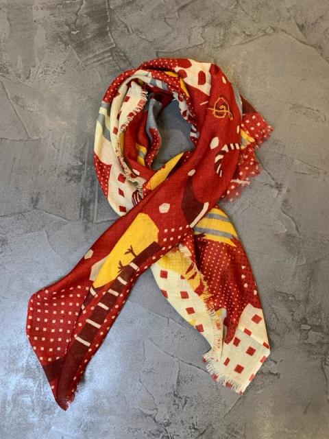 懐かしい賑やかなお正月を思い出す、あたたかでかわいい柄いき、鮮やかな赤色が新しい年の始まりを感じさせます。2025年の干支である大きなヘビは、早くも次の年を見つめ、すぐ隣では猪が走り去ろうとしている。羊の毛糸で遊ぶ虎や、楽器に隠れた動物など、ストールに潜むかわいい十二支たちをぜひ見つけてみて下さい。