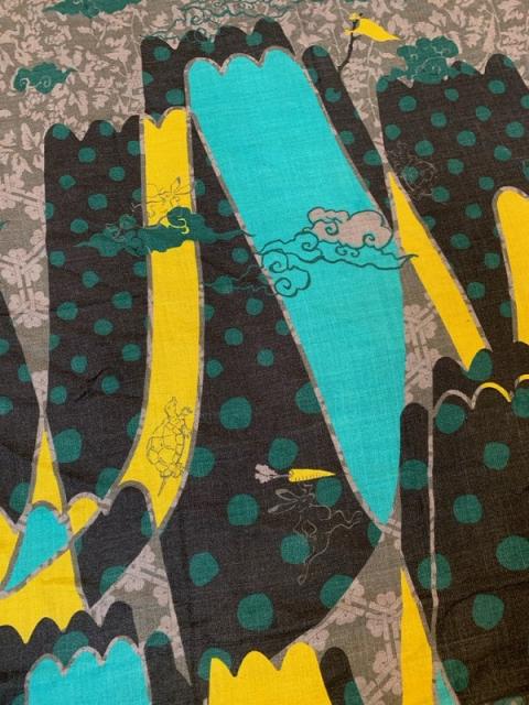 渋いチャコールグレーの色にイエローとエメラルドグリーンが入りポップ感あるリズミカルなストールです。