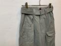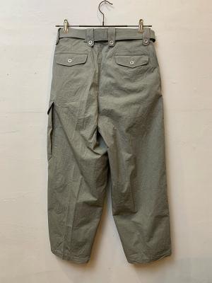 イギリス軍の40年代タイプのグルカパンツとベルギー軍のミリタリーパンツを融合させた、独創的なデザインに仕上げました。最大の特徴は、片側に配置されたガンポケットとカーゴポケット!私の大好きなアイテムを融合させたこのパンツは、共生地で長めに作ったベルトもアクセントになっています。