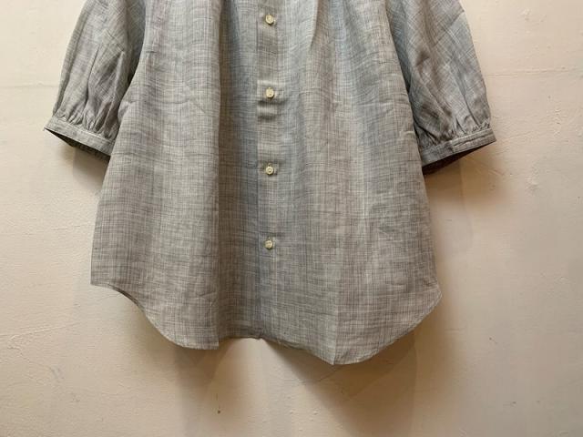 素材は麻の中でも繊維の太さが均質なラミー100%使用し、経糸と緯糸に異なる色のトップ糸を張り織り上げた、贅沢なシャンブレーです。上品な透け感があり、見る角度によって少々色の見え方が変化する、とても表情のある生地で、ギャザーをたっぷり寄せブラウスを製作しました。