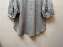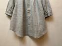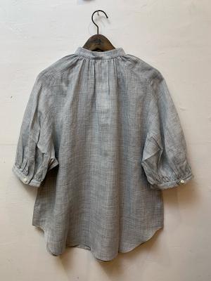 素材は麻の中でも繊維の太さが均質なラミー100%使用し、経糸と緯糸に異なる色のトップ糸を張り織り上げた、贅沢なシャンブレーです。上品な透け感があり、見る角度によって少々色の見え方が変化する、とても表情のある生地で、ギャザーをたっぷり寄せブラウスを製作しました。