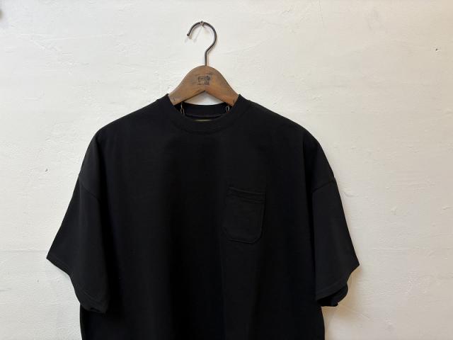 素材はインド産長綿を極細番手に紡績をし、32ゲージというハイゲージで編み上げたシンプルな天竺生地を使用しました。しっかりとしたウォッシュ加工、タンブラーを数回経ているため、ハリがありながらも少しカラッとした天日干しをした様な風合い、色落ち感が特徴です。その生地で身幅を今までになくワイドにとったクルーネックのポケットTeeを製作しました。