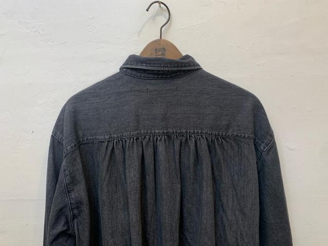 着用時は、フロントから見ると一見シンプルなアイテムですが、横から見た時に縦のラインが効いてスタイリングがぐっと引き締まります。全体的にゆとりのあるボックスシルエットで、フロントはメンズライクな印象、後ろのヨークにはギャザーが入っておりバックから見ると女性らしさのあるデザインです。