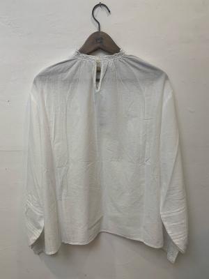 スタンドカラーの衿ぐりや、レースが少し透けて見えるカフス、袖に入ったピンタックなど細部にかけてとことんこだわったクラシカルな一着。きれいめに着用していただくのはもちろん、あえてワイドなデニムアイテムにインした抜け感のあるスタイルもおすすめです。