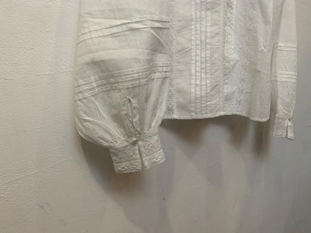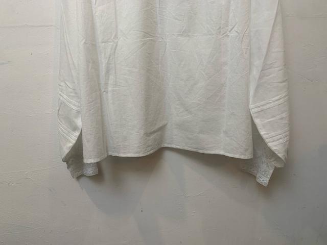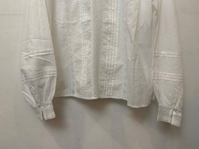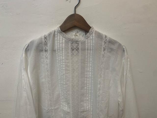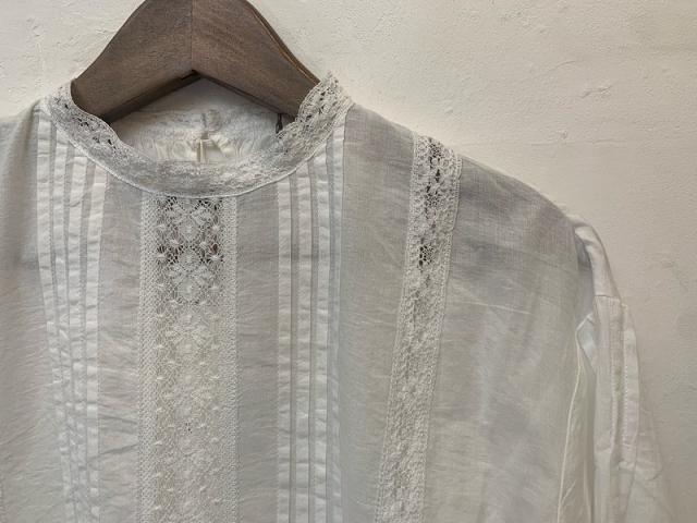 スタンドカラーの衿ぐりや、レースが少し透けて見えるカフス、袖に入ったピンタックなど細部にかけてとことんこだわったクラシカルな一着。きれいめに着用していただくのはもちろん、あえてワイドなデニムアイテムにインした抜け感のあるスタイルもおすすめです。