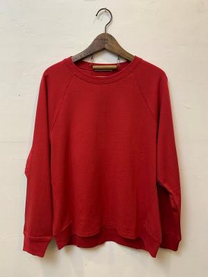 袖はゆったりしたラグランスリーブで、裾の後ろ側はリブ&タックが入ったラウンドシルエット。ヒップが程よく隠れる着丈でリラクシーな着心地なのに、一枚で様になるアイテムです。
