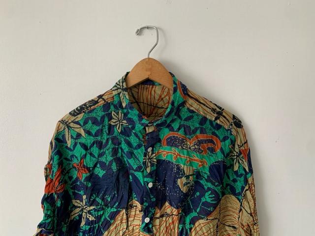 ストール柄を使用し、シャツに仕立てました。 シルクコットンの上品な素材感をそのままお楽しみください。