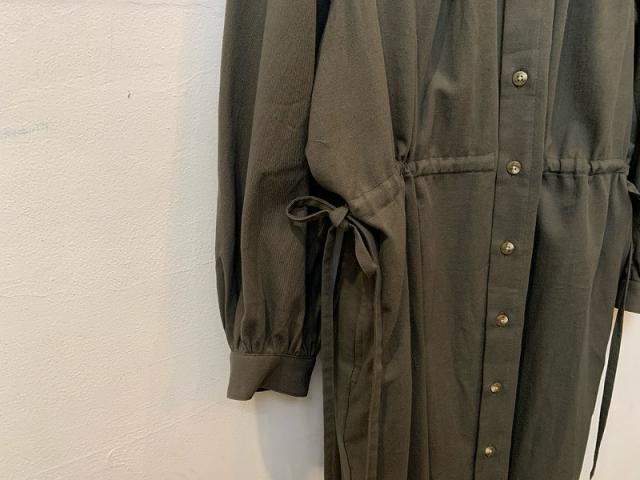 インド綿にカシミヤを5%混紡することで、ほんのりしっとりとした触感が加わったシャツ用ビエラ生地を使用し、襟元、背中、袖口、ウエストにたっぷりとギャザーを寄せたシャツドレスを製作しました。ウエストに共布スピンドルを通すことで、シルエットが大胆に変えられるのもこのシャツドレスの特徴です。通年着用できる、とても雰囲気のあるアイテムです。