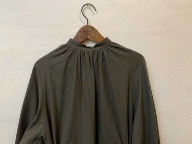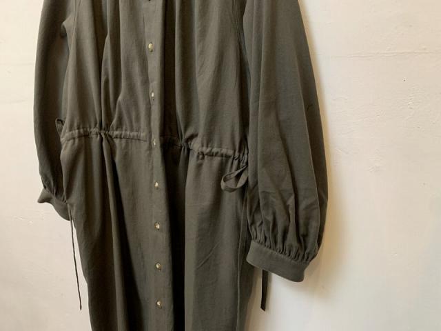 インド綿にカシミヤを5%混紡することで、ほんのりしっとりとした触感が加わったシャツ用ビエラ生地を使用し、襟元、背中、袖口、ウエストにたっぷりとギャザーを寄せたシャツドレスを製作しました。ウエストに共布スピンドルを通すことで、シルエットが大胆に変えられるのもこのシャツドレスの特徴です。通年着用できる、とても雰囲気のあるアイテムです。