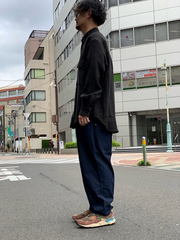 関西の工業地帯の中で、ひとりで旧織機のみを使用して生地を製作している機職人にお願いしました。ベルギーリネンと南米ウール素材で織り上げたキャンバス、へリンボン地を精錬、染色を複数回繰り返して仕上げた生地をしようしております。リネンキャンバスのしっかりとした生地感とシワ感、ウールの起毛感が合わさって、とても雰囲気のある表面に仕上がった生地で厚みと雰囲気のあるシャツジャケットを製作しました。インナーにニットを合わせても良いと思います。