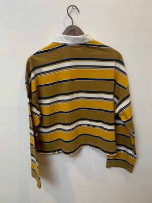 トレンド感のある、トラッドな雰囲気のラガーシャツプルオーバー。どこか懐かしい雰囲気のパネルボーダーが印象的なデザインで、秋のスタイリングの主役になること間違いなしの一枚。野暮ったくならないようなコンパクトな着丈にしており、ワイドめのパンツやスカートなど、ボリュームのあるボトムと好相性です。