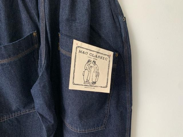 10オンスデニムを使用した定番マオパンツ。バイオ加工でソフトな仕上がりに。バックスタイルは大きなポケットのついたゆったりシルエット。ダボダボな大きいパンツを穿いた少年をイメージしてデザインされました。