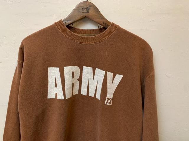 ヴィンテージのARMYプリントを忠実に再現したクルーネックスウェット。コットン素材のボディに顔料で製品染め、クラックプリント加工を施すことで、ヴィンテージの洗いざらし感と色合いを感じるような雰囲気に仕上げています。シンプルながらも存在感があり、スタイリングのアクセントになる一枚です。