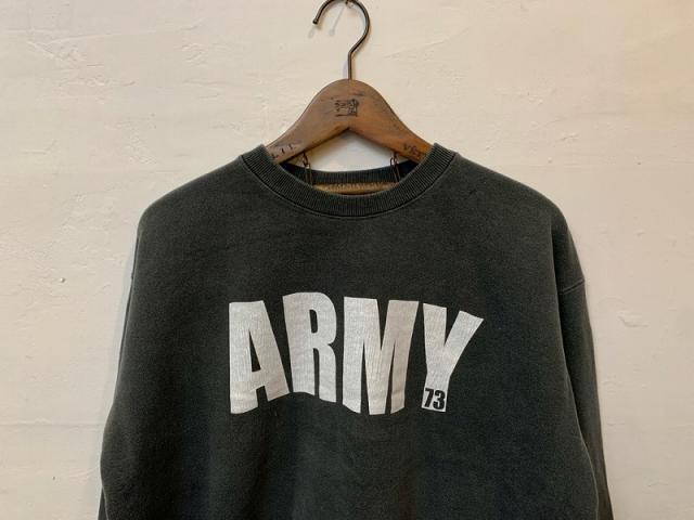 ヴィンテージのARMYプリントを忠実に再現したクルーネックスウェット。コットン素材のボディに顔料で製品染め、クラックプリント加工を施すことで、ヴィンテージの洗いざらし感と色合いを感じるような雰囲気に仕上げています。シンプルながらも存在感があり、スタイリングのアクセントになる一枚です。