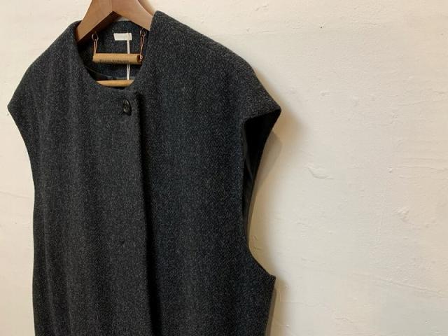 comm. arch. でご好評いただくジレアイテムを、今回は身幅や肩幅を少し広げ、どちらかと言うとスリーブレスコートのようなアウターとしても使用できるしっかり目アイテムに仕上げました。