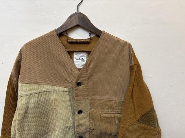 ユーズドのコーデュロイウェアを解体し、再構築したノーカラージャケット。解体する前のボディのディテールを活かしたパッチワークになっており、職人の手により一点一点組み合わせて作られています。
