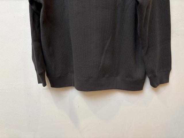 素材はアメリカのテネシー州メンフィスのミシシッピ川周辺で栽培されるメンフィス綿に、SSで多用するスーピマ綿をブレンドした素材を使用しております。どちらの綿も世界的にも歴史のある綿花生産地のものです。メンフィス綿は、乾いた空気と昼夜の大きな寒暖差により、ドライタッチでハリ感のあるタフな特徴があります。その綿を少し甘めに撚糸をした糸を使用し、逆にタイトめにワッフル生地を編みました。そうすることで触感は柔らかいのに、型崩れしづらく安心感のあるワッフルヘンリーP/Oとカーディガンを製作しました。生地がしっかりしているため下着っぽくならず、ウールアイテム時期が終わった春先から初夏まで活躍してくれるアイテムと思います。
