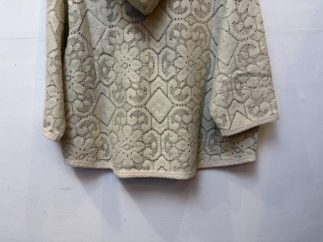 インドレースを使用したフーディタイプのブラウス。ヴィンテージ感のあるレースはシアー感があり、前ボタンを開けてレイヤードを楽しむスタイルがおすすめです。カジュアルなフーディーデザインがデニムと好相性で、薄手のインナーの上にさっと羽織るだけでスタイリングのアクセントになるアイテムです。