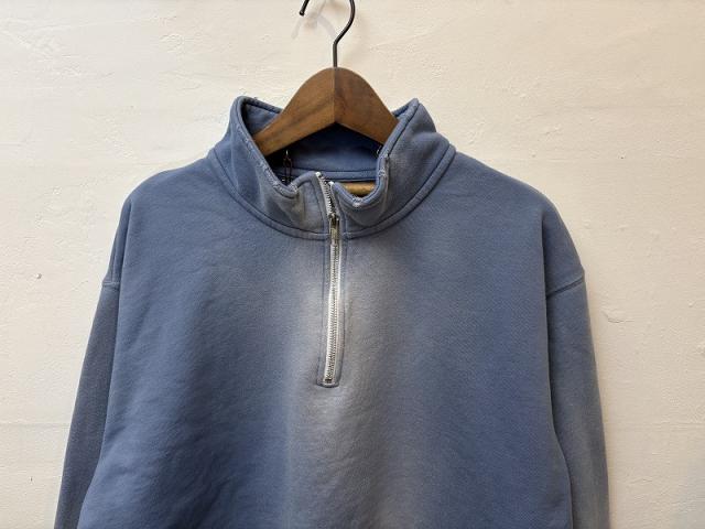 ムラ染めが特徴のハーフジップスウェットシャツ。初秋からちょうどいい厚みの10オンスの裏毛をスウェットに仕立て、製品染めとダメージ加工によりヴィンテージライクな雰囲気に仕上げています。ベーシックなシルエットでデニムと好相性!色違いで欲しくなるような幅広いカラー展開とスタイリングに映える発色で、一枚でも様になるアイテムです。
