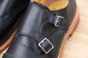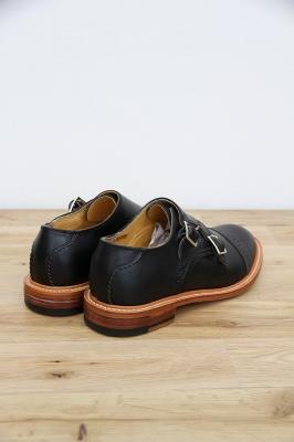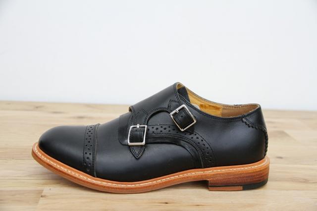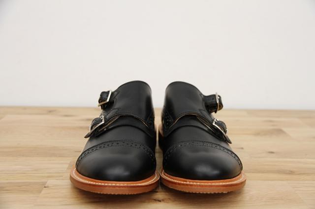 ストレートチップのダブルモンクストラップシューズ。アクセントとして加えたエナメルのレイヤードが特徴です。