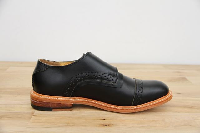 ストレートチップのダブルモンクストラップシューズ。アクセントとして加えたエナメルのレイヤードが特徴です。