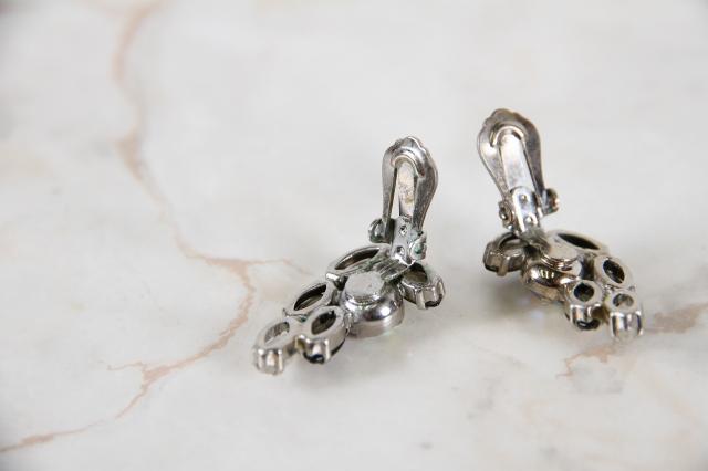 アメリカ製、オーロラのラインストーンにグレイッシュなカラーを組み合わせたシックなヴィンテージイヤリング。耳のふちに沿っていくようなフォルム。