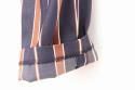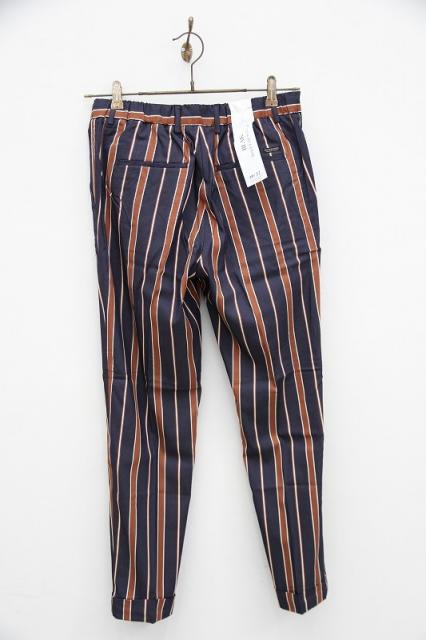 レーヨン素材のレギュラースリムフィットパンツになります。ドレープ感のある生地のため、さらっとした穿き心地を楽しんでいただけます。ウエストは紐で調整することが可能です。ネイビーとブラウンのストライプ柄、素材による光沢感により上品な一本となっております。