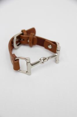 ホーススナッフルビットのパーツとレザーベルトが品のある雰囲気を漂わせるIDEANAのレザーブレスレット。腕時計とも相性のいいデザインです。