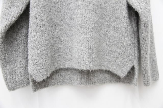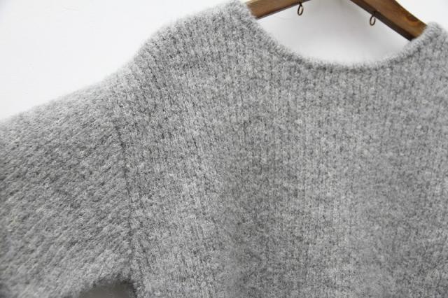 アルパカ(74%)とウール(26%)のみでループヤーンを紡績した毛糸で編み上げられたプルオーバーです。少しゆとりのある身幅で、ボートネックの首周り、サイドスリットが入った前後で段差のある裾のデザイン、リブは袖口のみに付くなど、シンプルでリラックス感のあるプルオーバーに仕上がっています。総針(フルニードル)でしっかりと編み上げているので、程良い重量感と弾力感、高い保温性があり、アルパカならではの滑らかな肌触りと相俟ってまるでウールのタオルに包まれているようなとても気持ち良い着心地になります。一般的に意匠糸(ファンシーヤーン)と呼ばれるこのような糸で化繊を混紡しないのはとても珍しいです。
