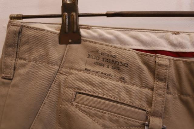 エンジニアブーツ等にも相性の良い若干太めのストレートチノです。通常EGO TRIPPINGのパンツの特徴として、座った時に中の物が落ちない様に右脇にZIPポケットが付いていますが、バイクを押す際にタンク等への傷を防ぐ為にこちらのパンツは左脇に取り付けられています。一番の特徴として雨の日にも対応出来る様、撥水加工が施されています。20番糸を使用し、2本針環縫いミシンの縫製で仕上げており、ZIPにはWALDESのヴィンテージタイプの物を使用しています。バックの斜めにとったダーツやポケット周りのステッチ、ウエスト部分のスタンププリントもポイントです。ウエスト部分内側はマーベルトやパイピング、パンツ吊り等高級スラックスに見られる仕様で仕上げています。