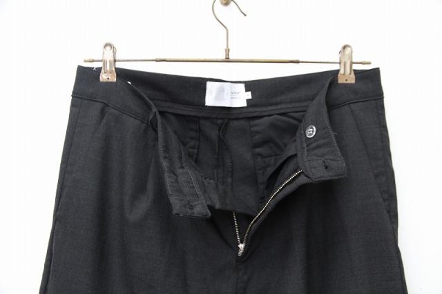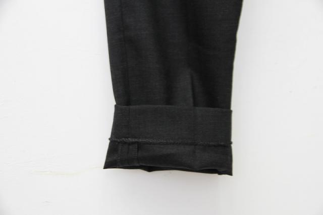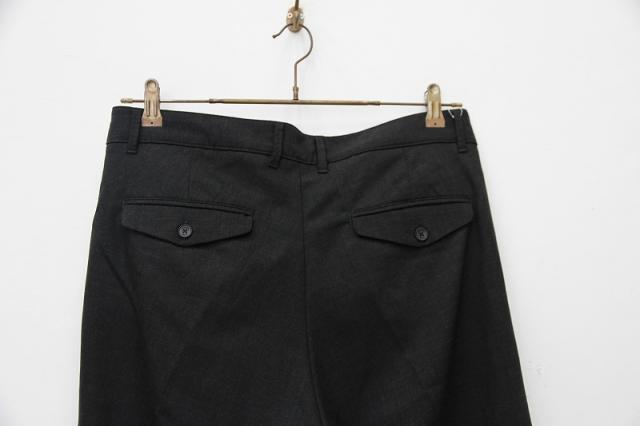 テーパードシルエットのタック入りスラックスです。ポリエステルとウールにストレッチ素材を混合した生地でスーツスラックスのマットな質感ながら、伸縮性抜群です。バックポケットにはフラップが付いてます。ゆったり目の太ももから裾にむかって綺麗なラインに仕上げられたシルエットが格好良く、履き心地の良いテーパードパンツです。