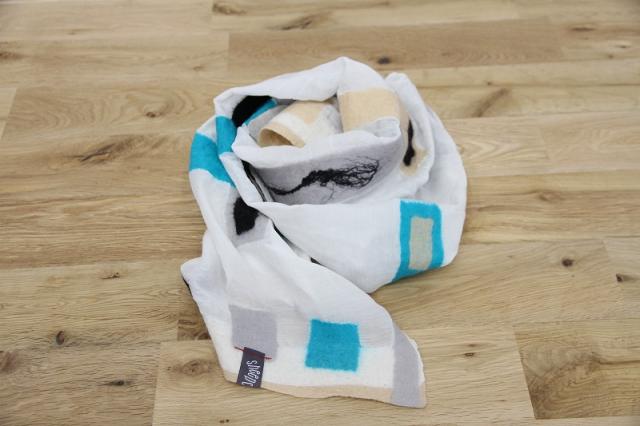 カラフルな色と、異素材を組み合わせたデザインが特徴的なSheepcountのストールです。シルクとウールの組み合わせは、通気性、保湿性、保温性を兼ね備えた素材感。長い期間お使いいただけます。
