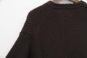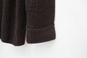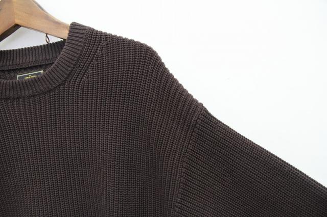 コットン糸を使用した7ゲージの両アゼ組織で編み立てています。しっかりとした肉感ながら使用している糸がコットン糸なので、長いシーズン着用する事が出来ます。一見シンプルなデザインですが、近年主流な裁断してミシンで縫製するというカット仕立てではなく、希少なフルファッション編み機を使用して、繊維を切断することなくボディパネルやスリーブなどのパーツを型紙通りの形状で編みたててあります。編み上がったボディパネルやスリーブは、リンキング仕上げを熟練した職人により手作業で縫い合わせられ、綺麗な継ぎ目に仕上げられています。フルファッション編み機の特性を活かして、アーム、ネック部分などに入った減らし目や移し目が機能性と共にアクセントになっています。着用すると柔らかいドロップ気味な袖と全体の微妙なバランスのサイジングによるシルエットが特徴です。シンプルながらも非常に手の込んだ、着用してより良く見えるアイテムです。