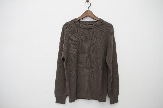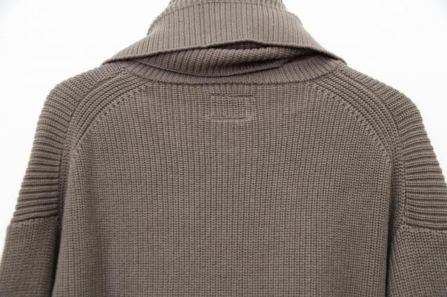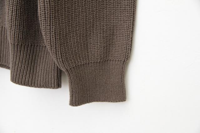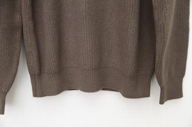 コットン糸を使用し、7ゲージの両アゼ組織で編み立てたニットです。しっかりとした肉感ながら使用している糸がコットン糸なので、長いシーズン着用する事が出来ます。一見シンプルなデザインですが、近年は裁断しミシンで縫製というカット仕立てニットが主流ですがフルファッション編み機を使用して、繊維を切断することなくボディパネルやスリーブなどのパーツを型紙通りの形状で編みたてました。編み上がったパーツは、リンキング仕上げを熟練した職人により手作業で縫い合わせられ、綺麗な継ぎ目に仕上げられています。