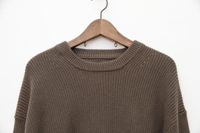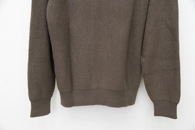 コットン糸を使用し、7ゲージの両アゼ組織で編み立てたニットです。しっかりとした肉感ながら使用している糸がコットン糸なので、長いシーズン着用する事が出来ます。一見シンプルなデザインですが、近年は裁断しミシンで縫製というカット仕立てニットが主流ですがフルファッション編み機を使用して、繊維を切断することなくボディパネルやスリーブなどのパーツを型紙通りの形状で編みたてました。編み上がったパーツは、リンキング仕上げを熟練した職人により手作業で縫い合わせられ、綺麗な継ぎ目に仕上げられています。