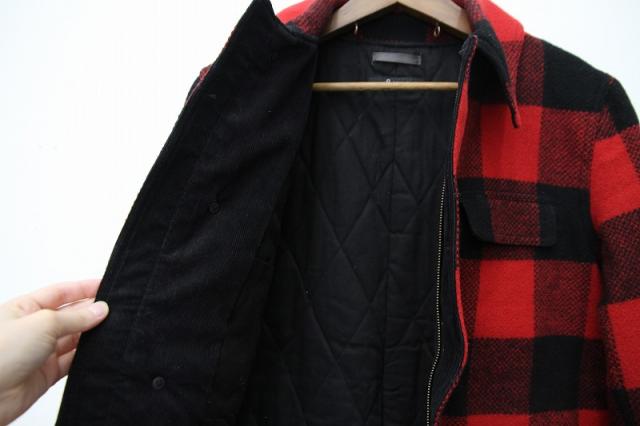 アメカジのバッファローチェックのウールジャケットです。腰にかかる丈感で様々なコーディネートを楽しめます。マチのついた立体的なポケットや衿裏に貼られたブラックコーデュロイなどこだわり満載です。薄めに中綿が入っており東北の冬も安心です。