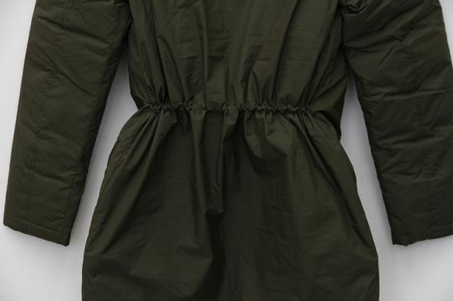 ダブルジップ仕立てのロングアウターです。ナイロン素材の中にダウンが多く詰め込まれた本格派。袖口は防寒用にリブ付で東北の寒さに対応可能です。ウエストは内側で絞れる機能付きでスマートなシルエットにも。驚きの軽さにより肩こりの心配もありません。