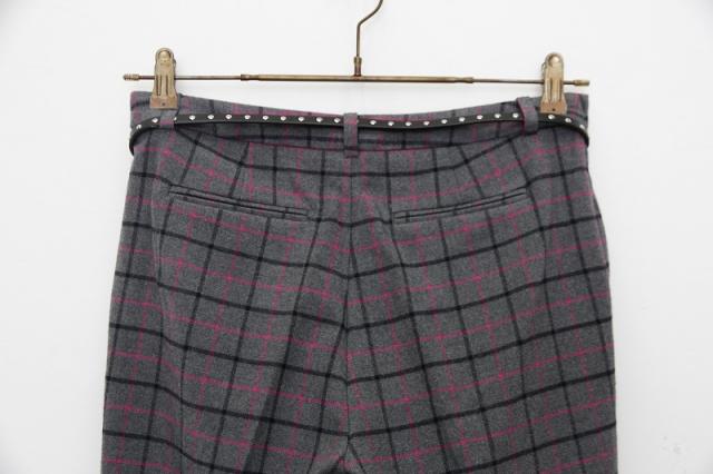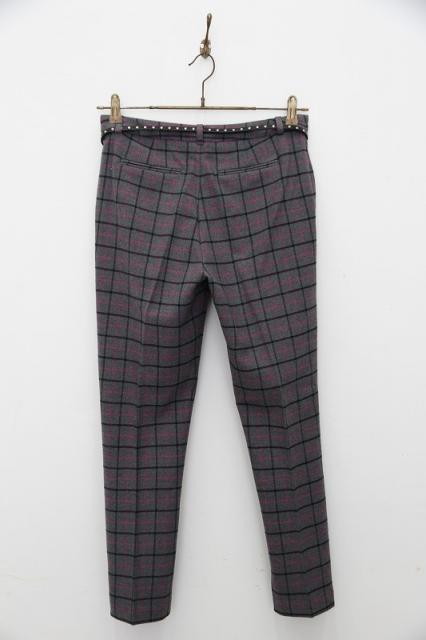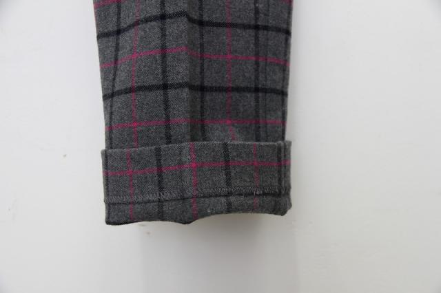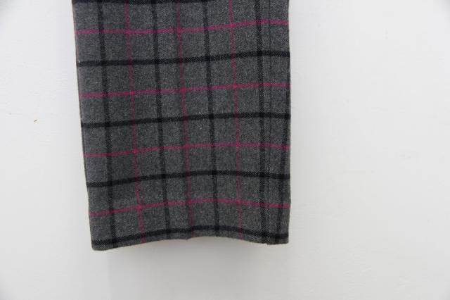 ウールのような肌触りと暖かさを兼ね備えたスラックスパンツ。グレーを基調にピンクと黒のラインが入ったチェック柄です。無地のニットやアウターと合わせて秋冬のコーディネートのアクセントになる一本です。センタープレスが入っておりしっかり見えします。