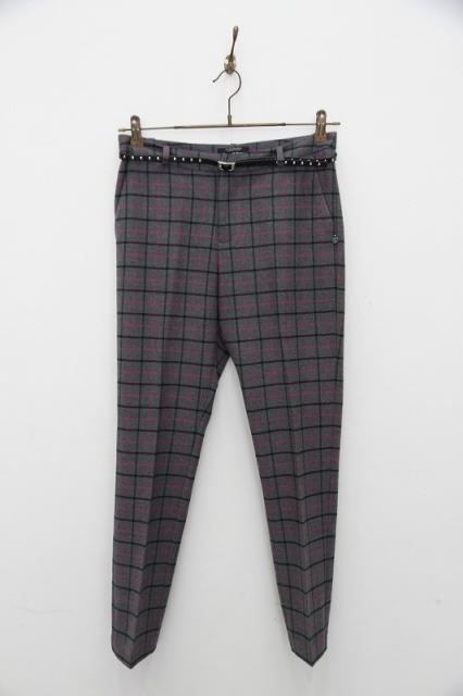 ウールのような肌触りと暖かさを兼ね備えたスラックスパンツ。グレーを基調にピンクと黒のラインが入ったチェック柄です。無地のニットやアウターと合わせて秋冬のコーディネートのアクセントになる一本です。センタープレスが入っておりしっかり見えします。