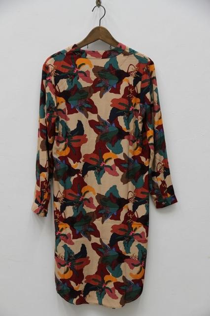 ビスコースを使用したVネックのプルオーバーシャツワンピースです。適度に薄く、軽い素材なため様々な場面で使えます。柄にはベージュやグリーン、赤など複数の色が入っており、コーディネートを楽しくしてくれる一着です。