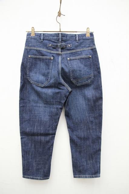 ワークテイストの8分丈ジーンズです。 ポケットの配置バランスやライトな生地感により軽さを感じるジーンズです。 腰回りに少し丸みを持たせ、ひざから裾にかけて絞り込んだ程よいサルエルシルエット。 腰穿きしてロールアップして軽く着こなして頂きたいアイテムです。