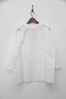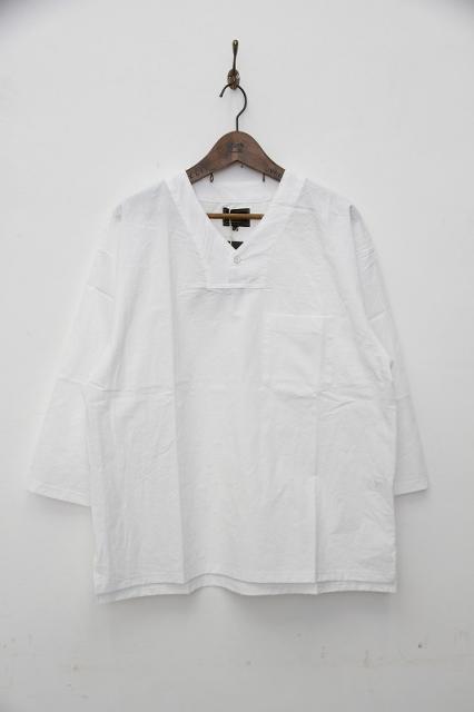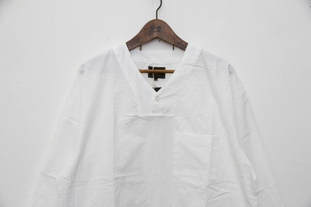 コットンのダンプ素材を使用しています。60年代のルーマニア軍のスリーピングシャツをモディファイしたデザイン。V-NECKとHENRY-NECKがMIXしたネックラインが特徴です。大人っぽくサラッと着用出来るアイテムです。袖は七分丈。硫化染めのトリプルウォッシュ加工により雰囲気のある仕上がりになっています。