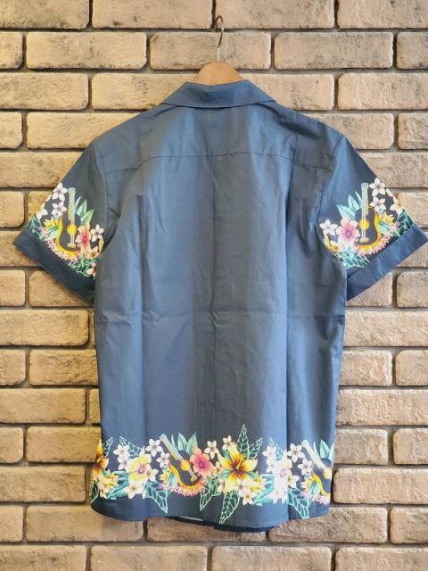 フロントはもちろん、袖とバックした部分に施されたプリントがアクセントのオープンカラーシャツです。ネイビーベースなのでアロハシャツの中でも大人の雰囲気を演出するデザインです。