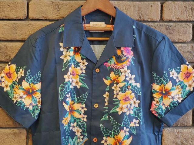 フロントはもちろん、袖とバックした部分に施されたプリントがアクセントのオープンカラーシャツです。ネイビーベースなのでアロハシャツの中でも大人の雰囲気を演出するデザインです。