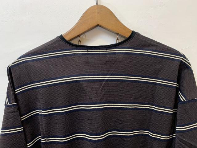 70年代の古着をイメージしたボーダー柄をコットンコーマ糸を使用し、シルケット加工することにより、表面感が綺麗で適度に光沢感を持たせたオリジナル生地を使用したカットソーです。レギュラー気味の肩幅にワイドな身幅の身頃に、ワイドな袖を付けたシルエットになります。裾のコードは途中からゴムに切り替える事により伸縮性を持たせてあるので縛ったままでの着用が可能です。
