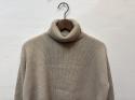 東北地方でハンドフレーム(手横編み機)のみでニットウェアを製作している職人の手で作られた貴重なニットです。糸はオーストラリアでも特に羊毛の質が高いジロン地方産のメリノ種の中で、生後6ケ月以内に刈り取った仔羊の毛を、更に繊維の細いものを厳選し、紡績した糸です。(スーパーエクストラファインラムと呼ばれる細さです。)度詰めで時間をかけて人力で編み立てているので保温性が高く、北国の気温の低い地域でも肌着の上に着用するだけでとてもあたかかく過ごすことができます。家庭での水洗いも可能です。