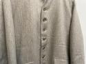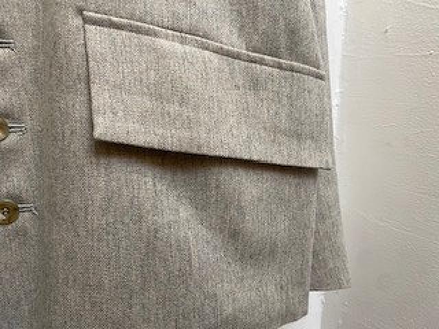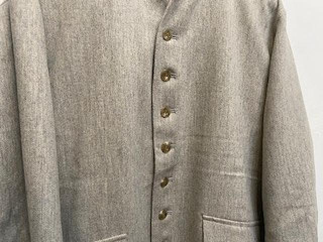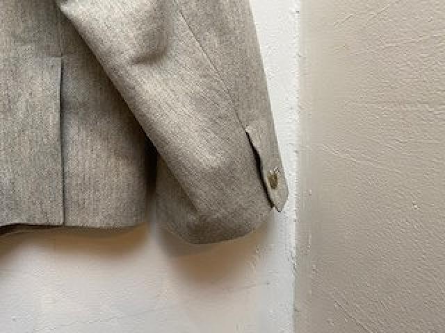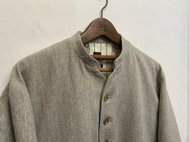 ウール混の柔らかいフラノ素材を使用しています。古い時代のイギリス軍のホスピタルチェルシージャケットをサンプリングしました。ワイドな身幅から裾に向けて狭くなった短めな丈の身頃、ワイドにしっかり振りの付いた袖、多めについた釦、少しVに開いたスタンド衿など袖を通した際にグッとくるアイテムです。肩線を後ろに振る事により柔らかいショルダーラインを出しています。
